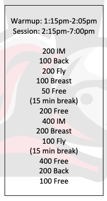 Arrival: 1:00pm Warm-up: 1:15-2:05pm Meet Starts: 2:15-7:00pm